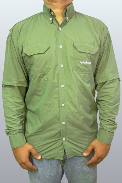 A Camisa Pescaria possui um tecido que traz conforto térmico, já que a ideia dela é que ela possa ser usada até em locais com alta incidência solar, já que algumas rotinas de trabalho pedem por essa mudança de local e consequentemente temperatura.
